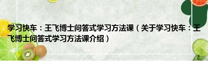 導讀 大家好,小耀來為大家解答以上的問題。學習快車:王飛博士問答式學習方法課,關于學習快車:王飛博士問答式學習方法課介紹這個很多人還不知
