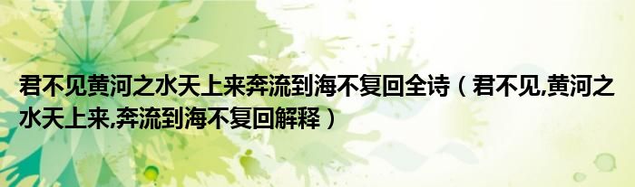 "黃河之水天上來,進入海洋,一去不復返,君不見",楊穎離黃河不遠,所以很受歡迎。黃河歷史悠久,落差巨大,如從天而降,一瀉千里,向東入海。這么強的浪景,肉眼不可能極差。作者要從天而降,“得自道”,語言夸張。最后一句說,河水的來臨勢不可擋;寫下下面這句話:去大化不可逆。時漲時消,形成一口氣,這是短句中所沒有的(如“黃河墮天,歸東海”)。黃河之水發源于西邊巍峨的昆侖山,蜿蜒九曲,震蕩東方,最后奔流入海。日日夜夜,一去不復返。詩人對黃河的夸張描寫是對短暫生命的隱喻。一旦它消失了,就再也不會回來,就像黃河一樣。感嘆人生稍縱即逝,卻很難再發光。因此,它導致了及時行樂和不辜負好時光的想法。本文到此結束,希望對大家有所幫助。