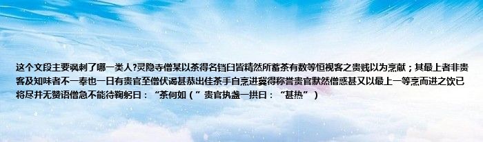 導讀 大家好,精選小編來為大家解答以上的問題。這個文段主要諷刺了哪一類人?靈隱寺僧某以茶得名鐺臼皆精然所蓄茶有數等恒視客之貴賤以為烹獻;