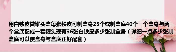 導讀 大家好,精選小編來為大家解答以上的問題。用白鐵皮做罐頭盒每張鐵皮可制盒身25個或制盒底40個一個盒身與兩個盒底配成一套罐頭現有36張白鐵